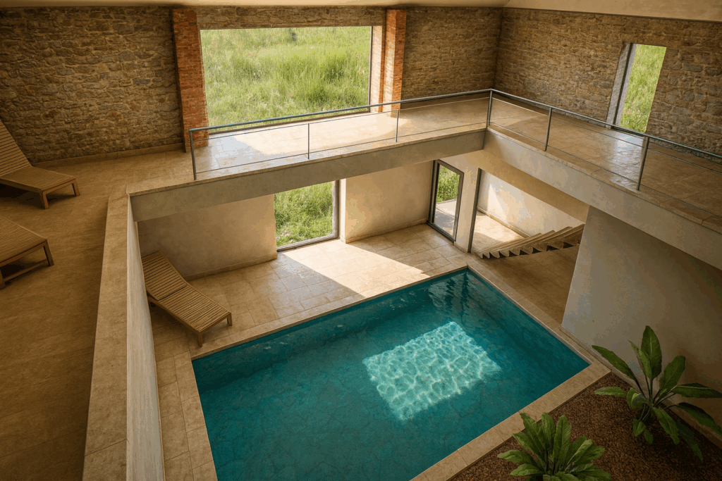 Lumière naturelle, matériaux chaleureux et ambiance apaisante créeront un cocon pour nager, transpirer, récupérer et partager un verre.
